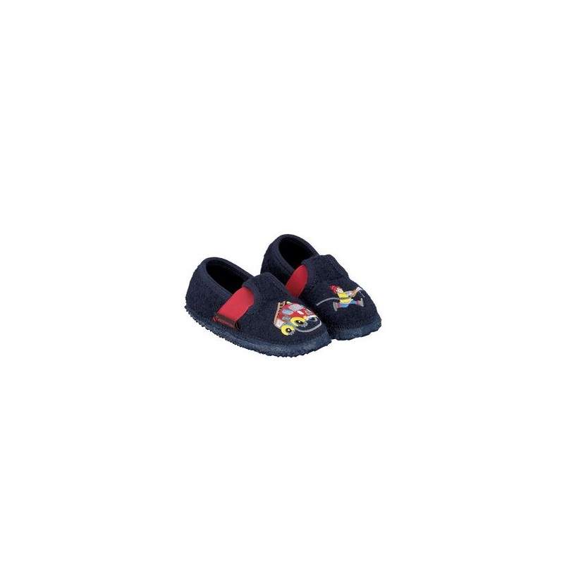 Jungen-Hausschuh mit einer detailreichen Feuerwehr-Stickerei und flauschiger Schurwolle. Die seitlichen Gummibänder sorgen für einen sicheren Halt. Die weiche Naturkautschuk-Sohle ist rutschfest, leicht, flexibel und verleiht ein Gefühl des Barfussgehens.