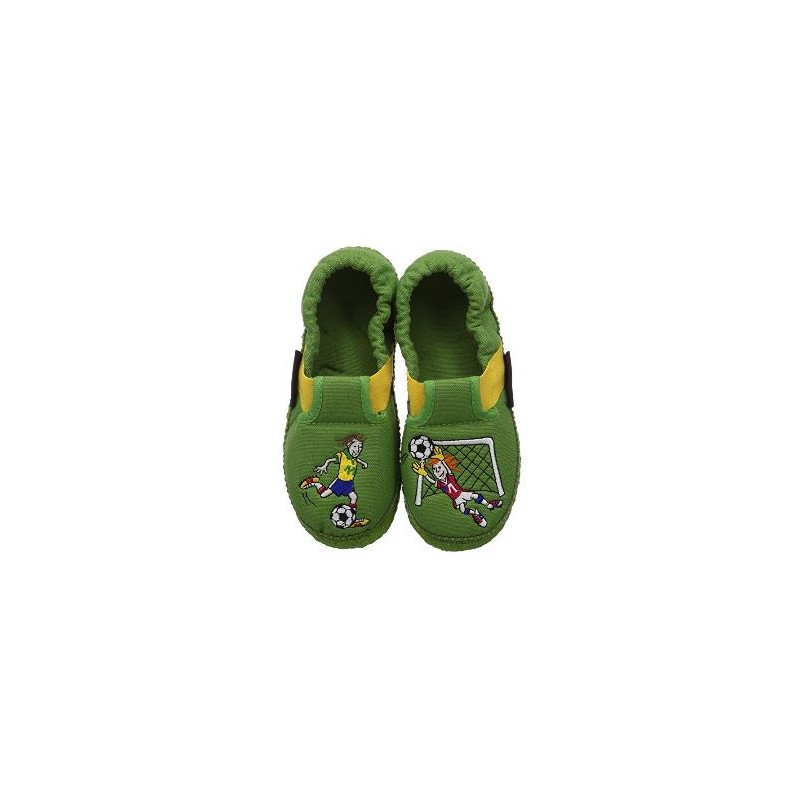 Grüne Kinderhausschuh Antwerpen (selby road) von Giesswein, Fussballerapplikationen, Gummizüge, waschhbar bis 30°.
